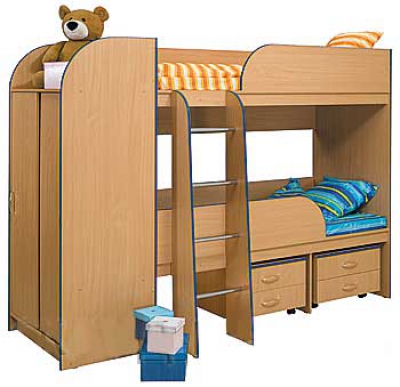 Шкаф-купе состоит из двух отделений: платяного для верхней одежды и секции с полками. Кровать имеет боковые бортики. Тумбы выкатываются на роликах и имеют по 2 выдвижных ящика. Лестница выполнена с надежными металлическими ступенями.